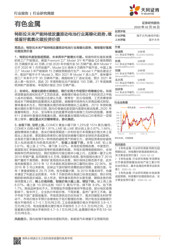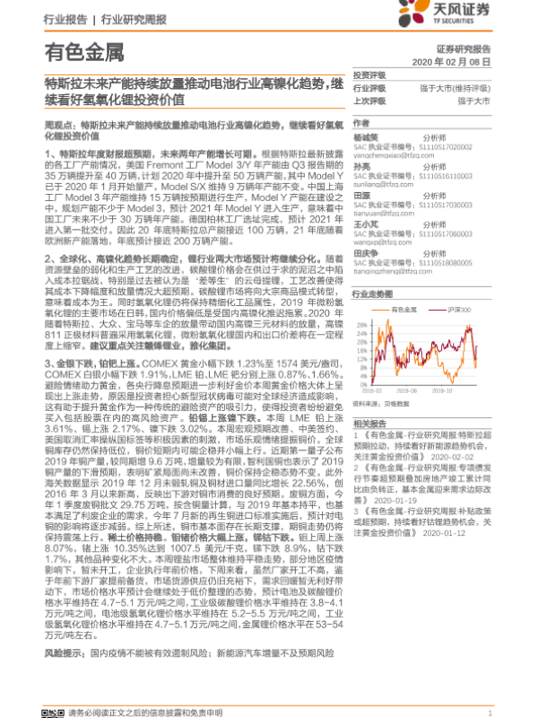【天风证券】【20200208】20200208-天风证券-有色金属行业研究周报:特斯拉未来产能持续放量推动电池行业高镍化趋势,继续看好氢氧化锂投资价值-15页