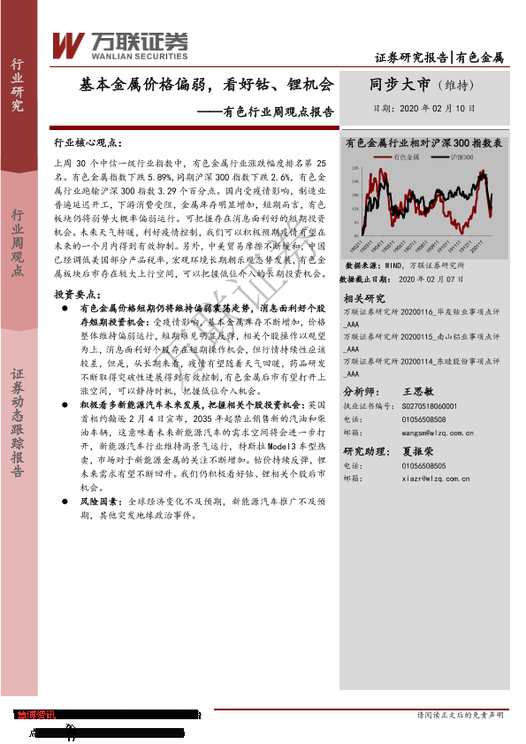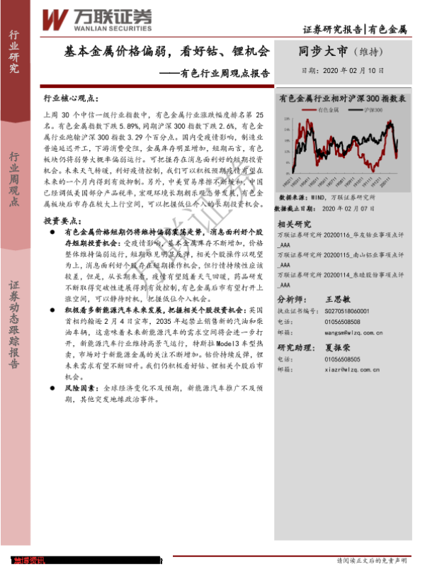 【万联证券】【20200210】20200210-万联证券-有色行业周观点报告:基本金属价格偏弱,看好钴、锂机会-11页