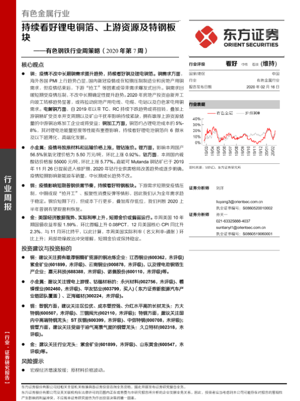 【东方证券】【20200216】2020年第7周有色钢铁行业周策略:持续看好锂电铜箔、上游资源及特钢板块-27页