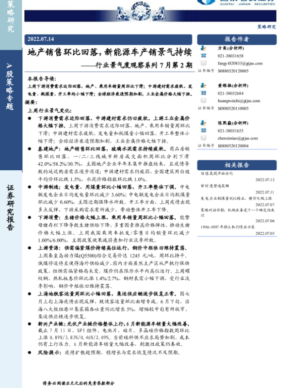 【国泰君安证券】【20220714】行业景气度观察系列7月第2期:地产销售环比回落,新能源车产销景气持续-15页