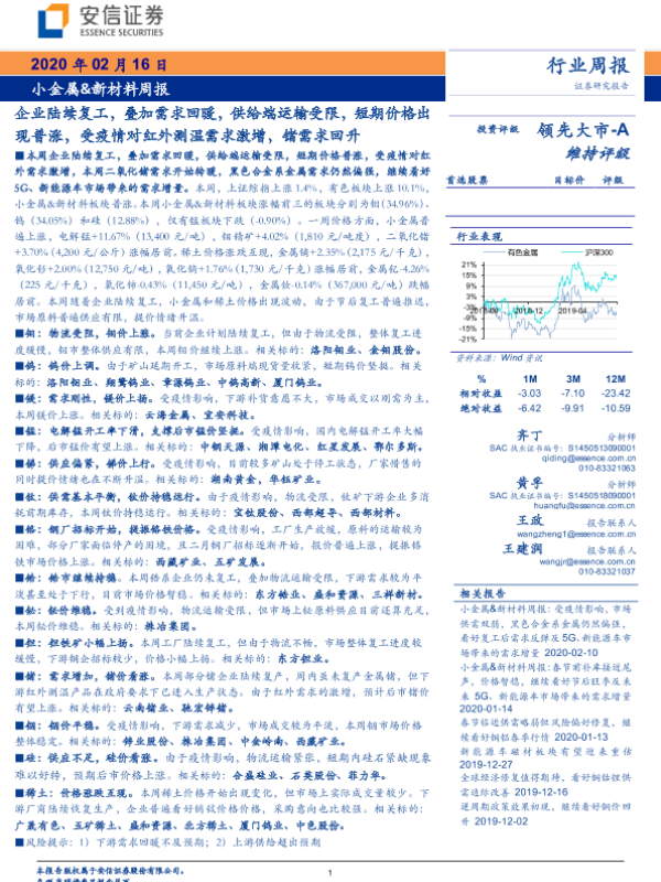 【安信证券】【20200216】20200216-安信证券-小金属&新材料行业周报:企业陆续复工,叠加需求回暖,供给端运输受限,短期价格出现普涨,受疫情对红外测温需求激增,锗需求回升-29页