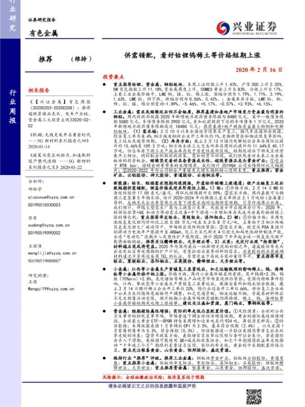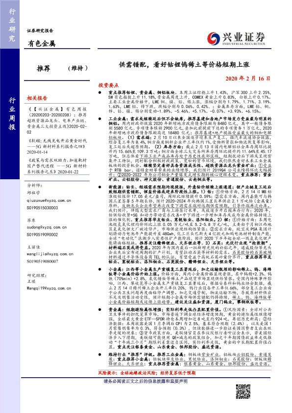 【兴业证券】【20200216】20200216-兴业证券-有色金属行业周报:供需错配,看好钴锂钨稀土等价格短期上涨-13页