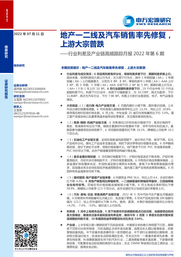 【申万宏源】【20220711】行业利差及产业链高频跟踪月报2022年第6期:地产一二线及汽车销售率先修复,上游大宗普跌-25页