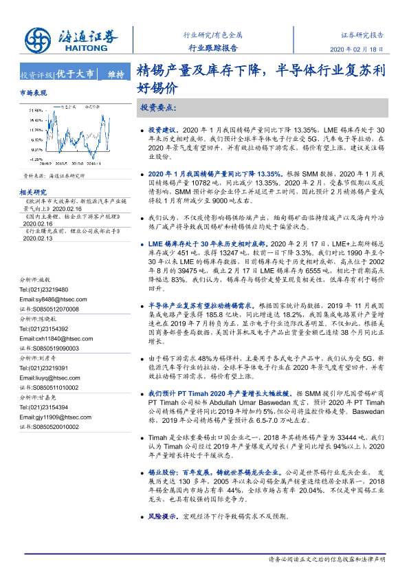 【海通证券】【20200218】20200218-海通证券-有色金属行业跟踪报告:精锡产量及库存下降,半导体行业复苏利好锡价-2页