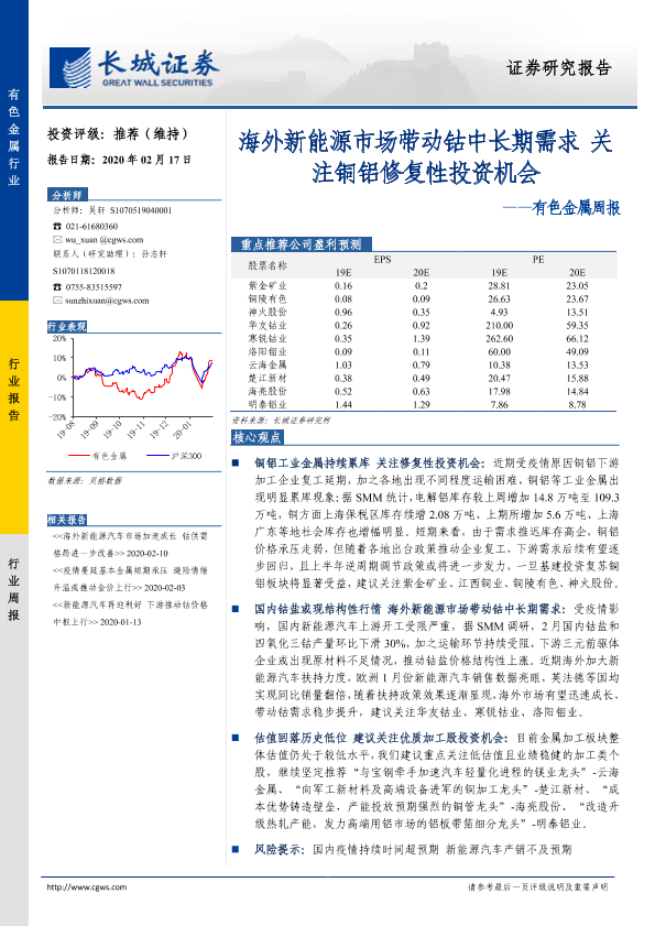 【长城证券】【20200217】20200217-长城证券-有色金属周报:海外新能源市场带动钴中长期需求 关注铜铝修复性投资机会-11页