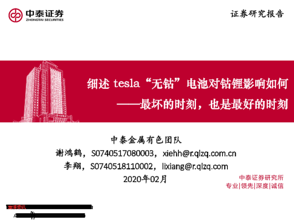 【中泰证券】【20200218】细述tesla“无钴”电池对钴锂影响如何:最坏的时刻,也是最好的时刻-9页