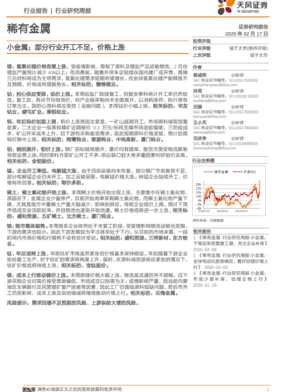 【天风证券】【20200217】20200217-天风证券-稀有金属行业研究周报:小金属:部分行业开工不足,价格上涨-15页