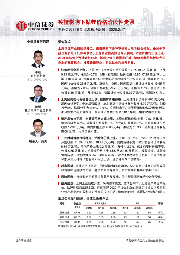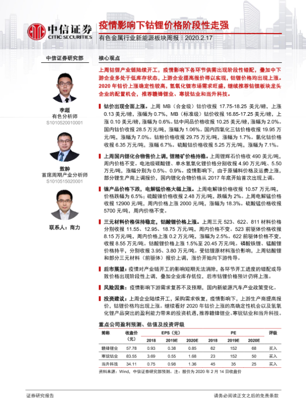 【中信证券】【20200217】疫情影响下钴锂价格阶段性走强-13页