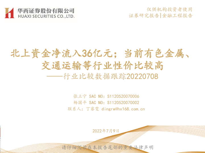 【华西证券】【20220709】行业比较数据跟踪:北上资金净流入36亿元;当前有色金属、交通运输等行业性价比较高-24页