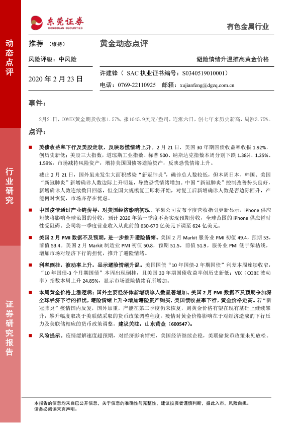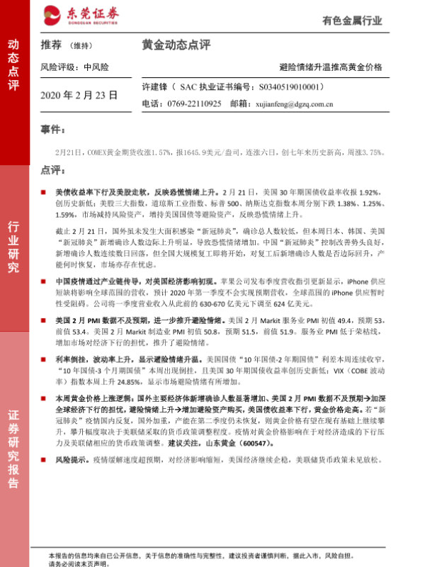 【东莞证券】【20200223】黄金动态点评:避险情绪升温推高黄金价格-4页