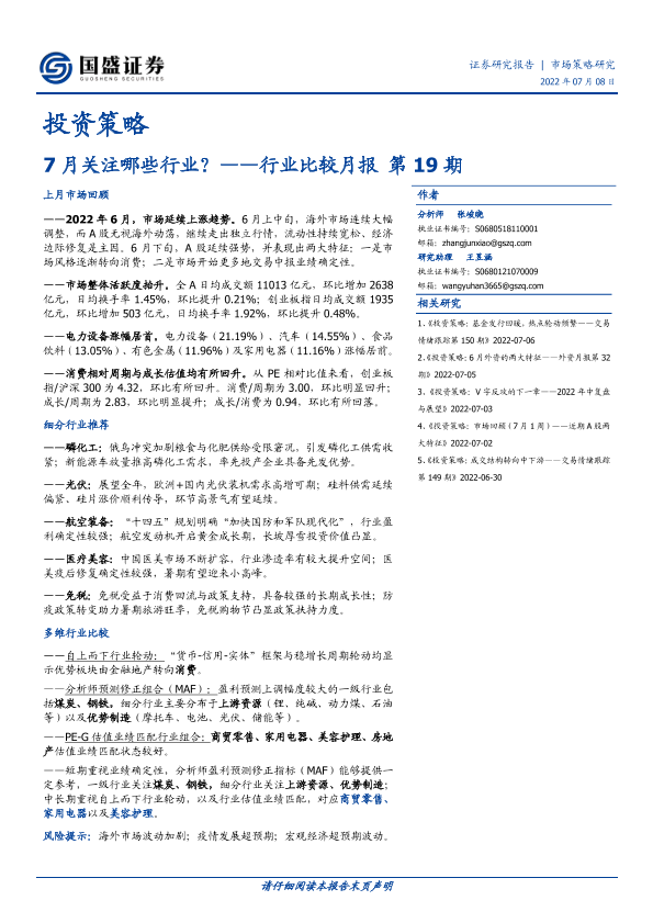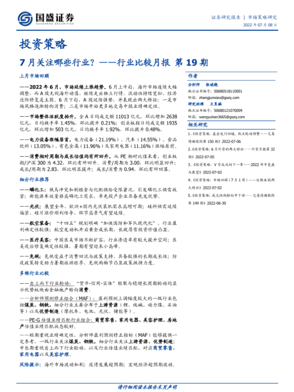 【国盛证券】【20220708】行业比较月报第19期:7月关注哪些行业?-20页
