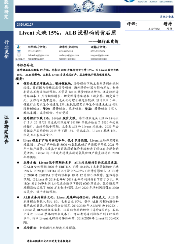【国泰君安证券】【20200223】Livent大跌15%,ALB没影响的背后原因 ——锂行业更新-3页