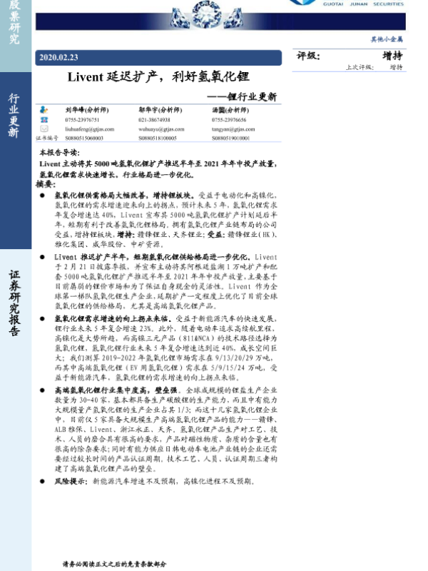 【国泰君安证券】【20200223】20200223-国泰君安-锂行业更新:Livent延迟扩产,利好氢氧化锂-4页