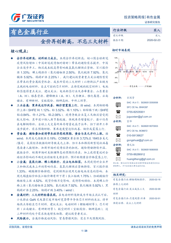 【广发证券】【20200223】20200223-广发证券-有色金属行业投资策略周报:金价再创新高,不忘三大材料-23页