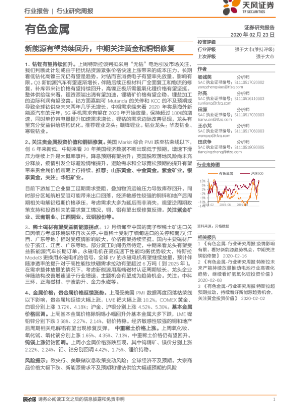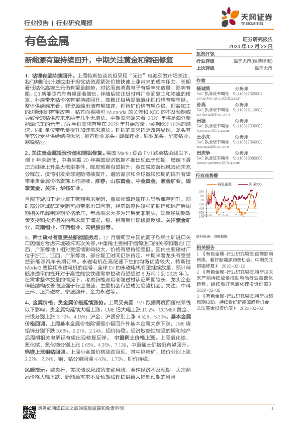 【天风证券】【20200223】20200223-天风证券-有色金属行业研究周报:新能源有望持续回升,中期关注黄金和铜铝修复-14页