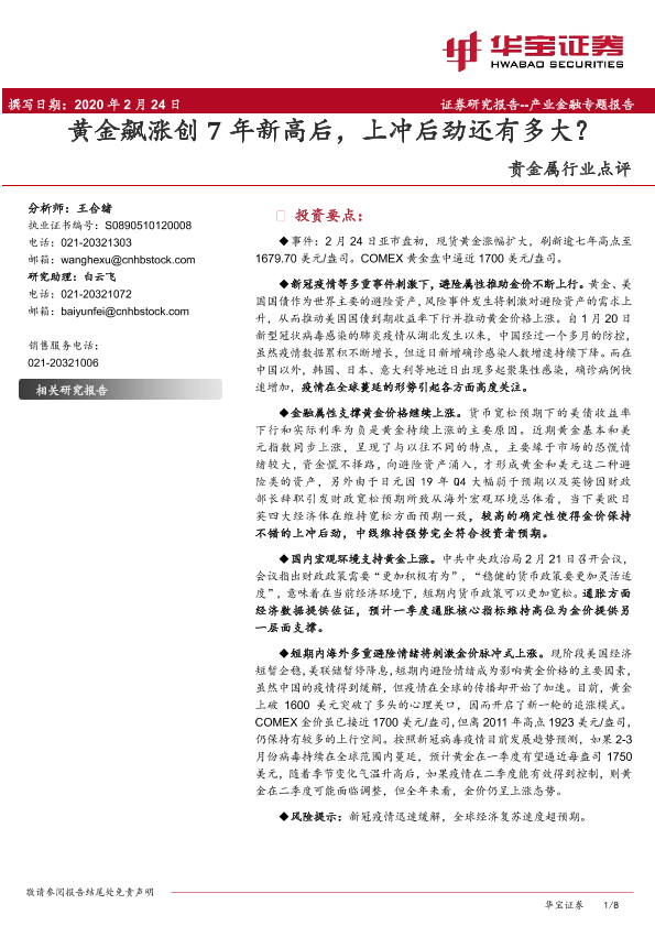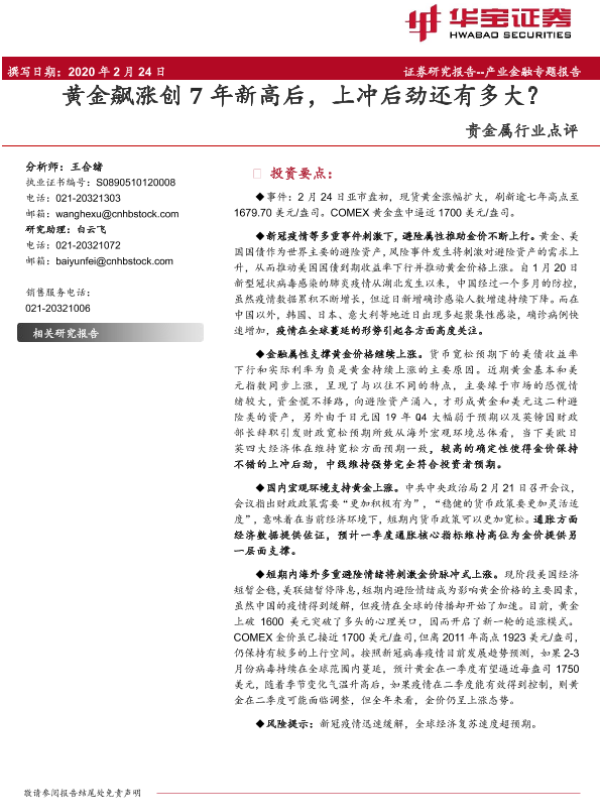【华宝证券】【20200224】20200224-华宝证券-贵金属行业点评:黄金飙涨创7年新高后,上冲后劲还有多大?-8页
