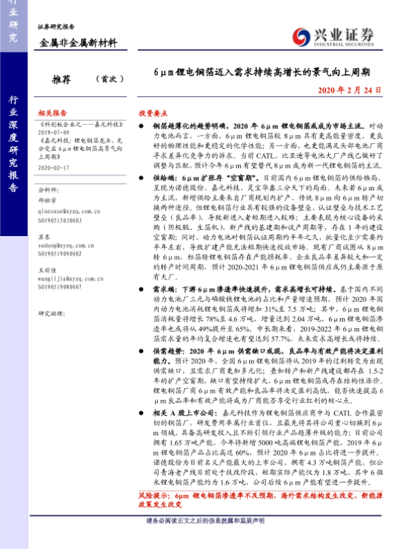 【兴业证券】【20200224】6μm锂电铜箔迈入需求持续高增长的景气向上周期-30页