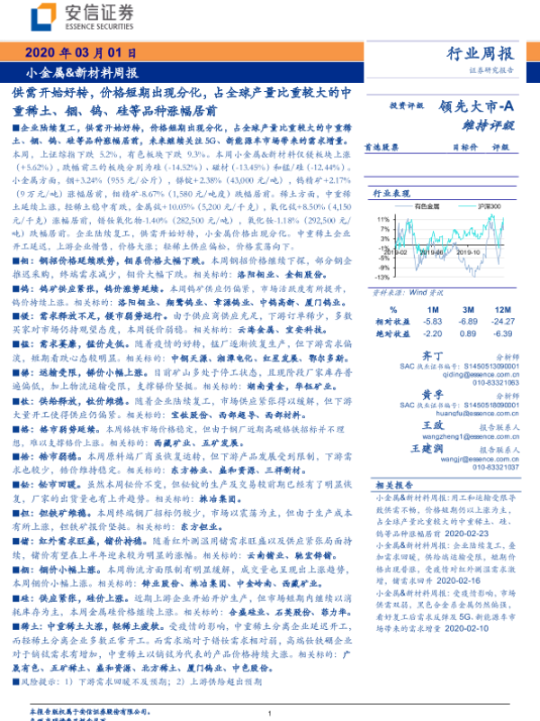 【安信证券】【20200301】20200301-安信证券-小金属&新材料周报:供需开始好转,价格短期出现分化,占全球产量比重较大的中重稀土、铟、钨、硅等品种涨幅居前-30页