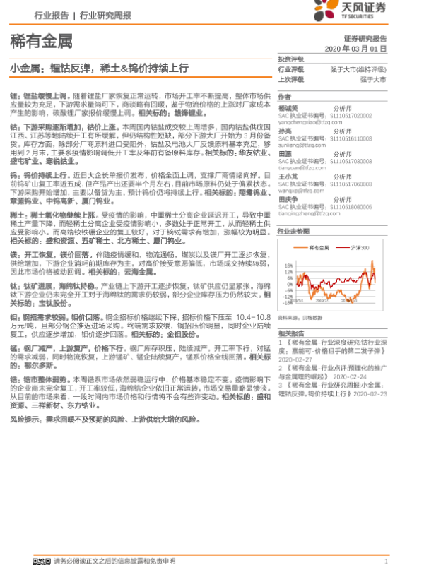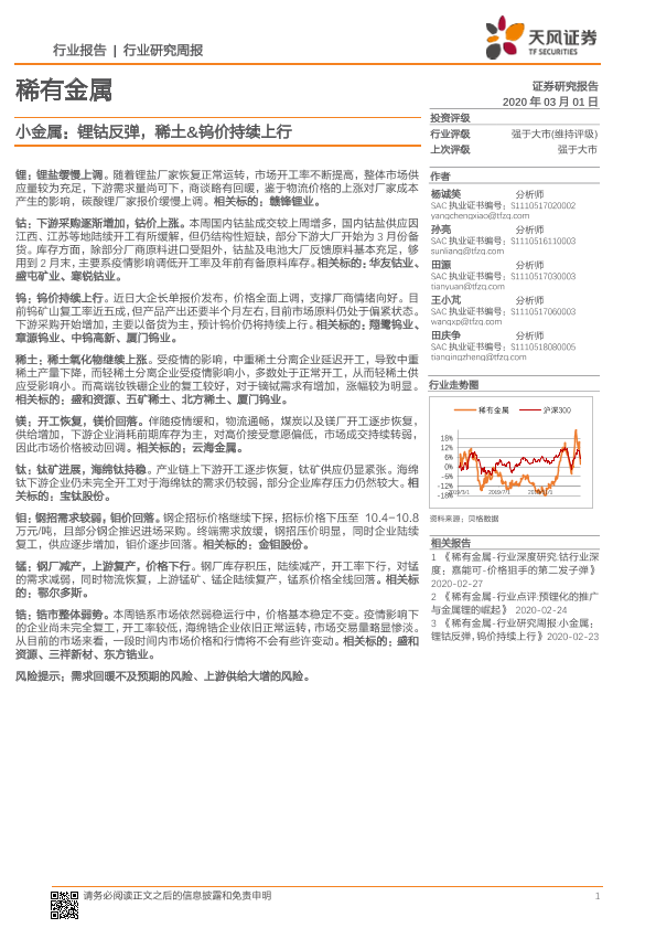 【天风证券】【20200301】20200301-天风证券-小金属:锂钴反弹,稀土&钨价持续上行-15页