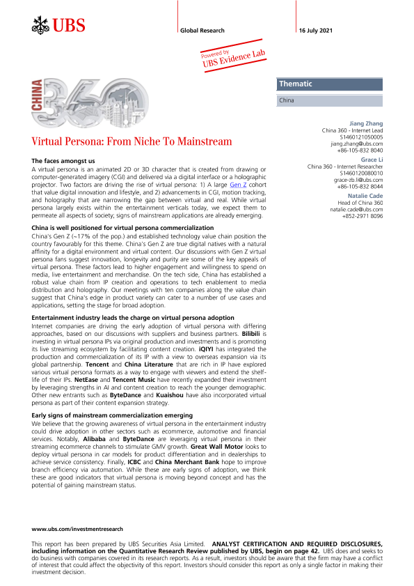 【UBS Securities Asia Limited】【20210716】瑞银-中国投资策略-虚拟人物:从小众到主流-46页