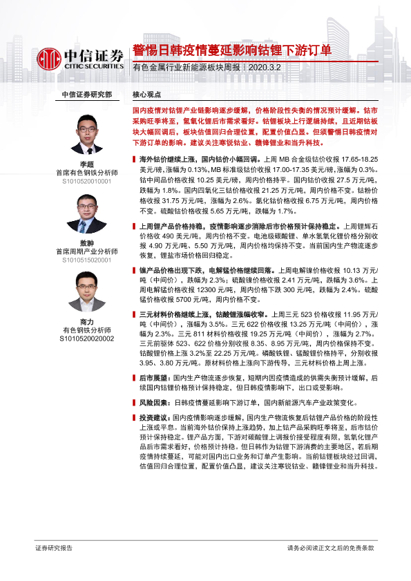 【中信证券】【20200302】20200302-中信证券-有色金属行业新能源板块周报:警惕日韩疫情蔓延影响钴锂下游订单-13页