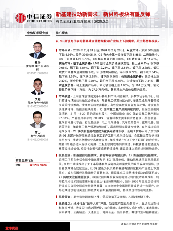 【中信证券】【20200302】20200302-中信证券-有色金属行业周度聚焦:新基建拉动新需求,新材料板块有望反弹-18页