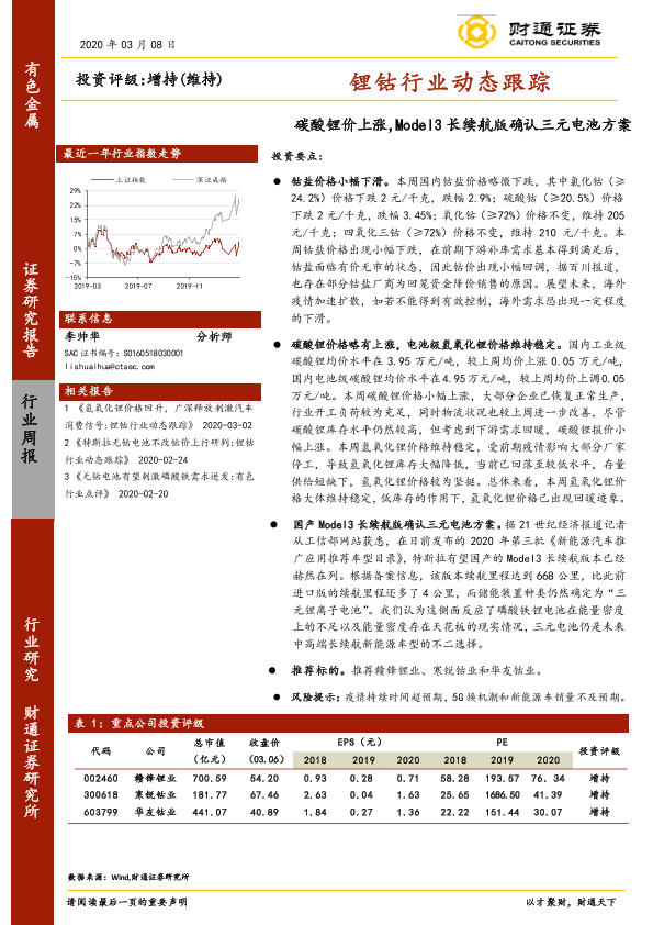 【财通证券】【20200308】20200308-财通证券-锂钴行业动态跟踪:碳酸锂价上涨,Model3长续航版确认三元电池方案-6页