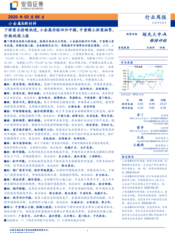 【安信证券】【20200308】20200308-安信证券-小金属&新材料行业周报:下游需求持续低迷,小金属价格回归平稳,中重稀土供需抽紧,价格延续上涨-33页