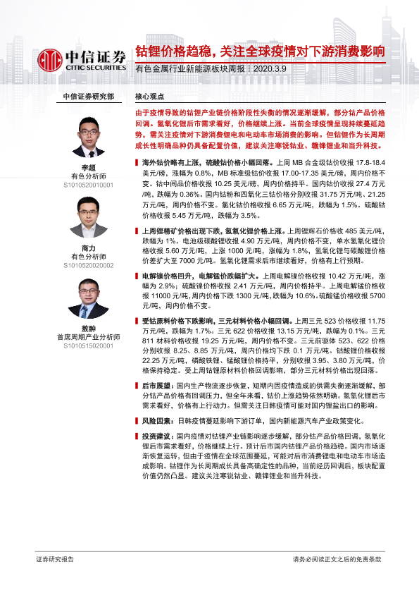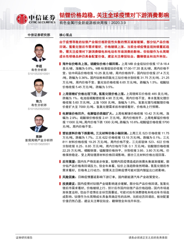 【中信证券】【20200309】有色金属行业新能源板块周报:钴锂价格趋稳,关注全球疫情对下游消费影响-13页