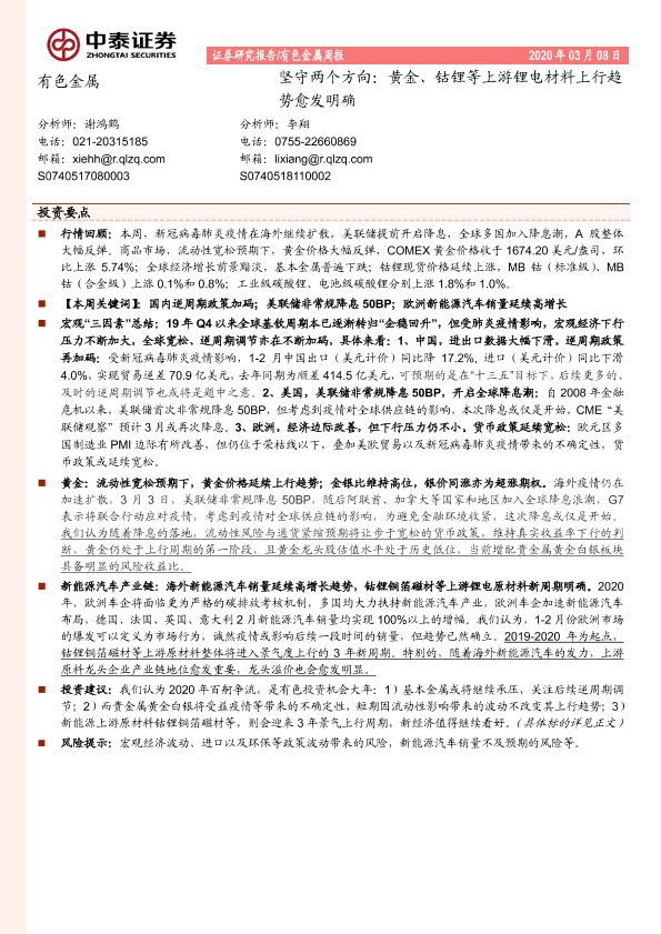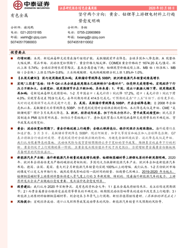 【中泰证券】【20200308】20200308-中泰证券-有色金属周报:坚守两个方向:黄金、钴锂等上游锂电材料上行趋势愈发明确-29页