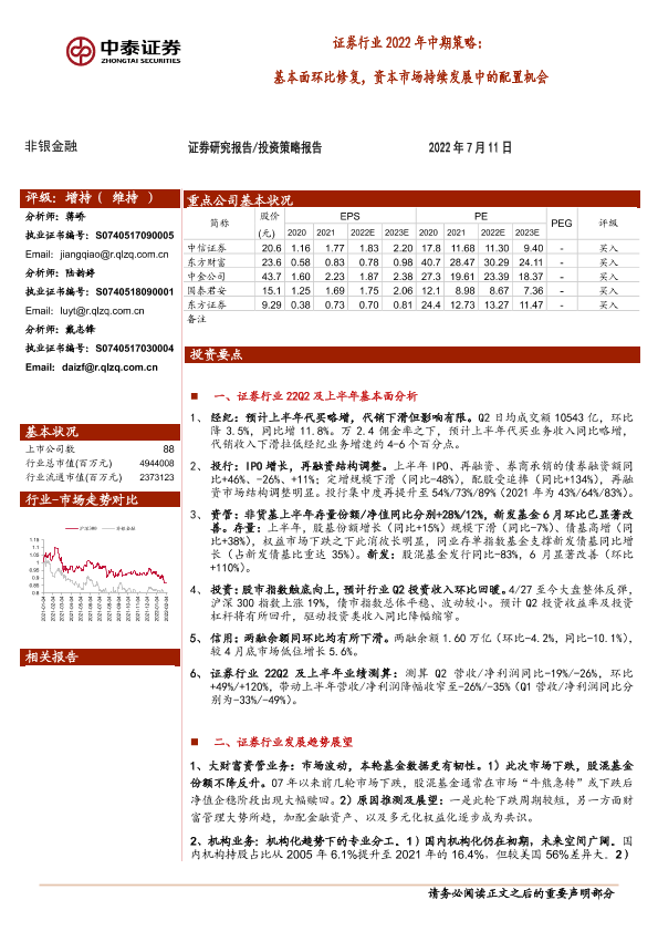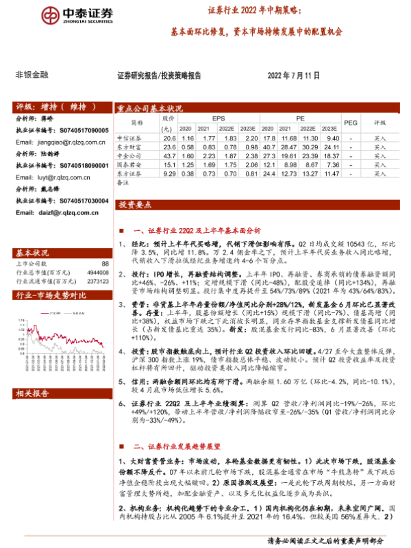【中泰证券】【20220711】证券行业2022年中期策略:基本面环比修复,资本市场持续发展中的配置机会-40页