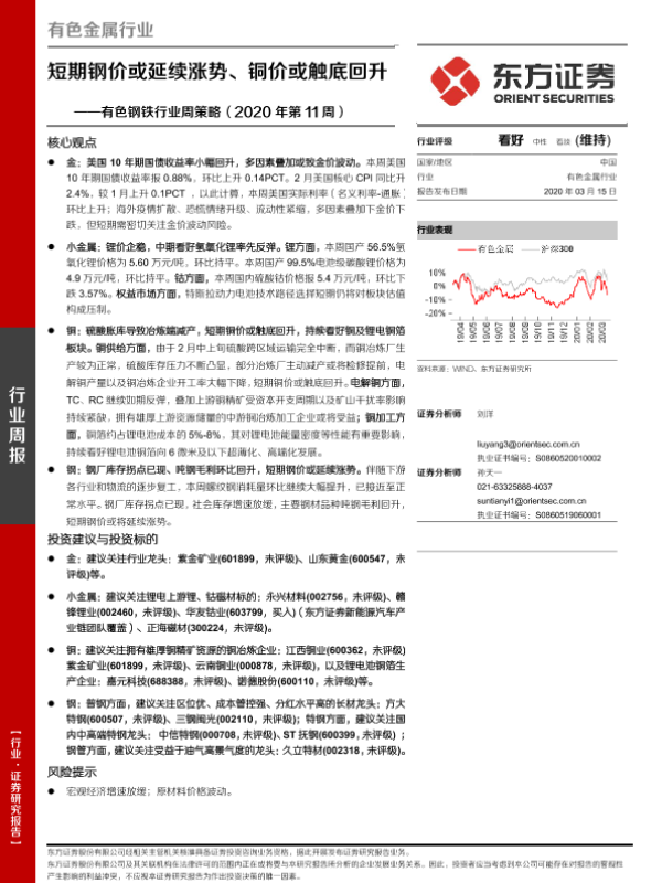 【东方证券】【20200315】2020年第11周有色钢铁行业周策略:短期钢价或延续涨势、铜价或触底回升-26页