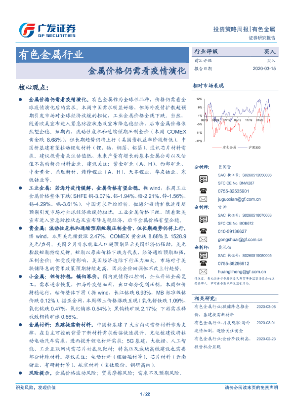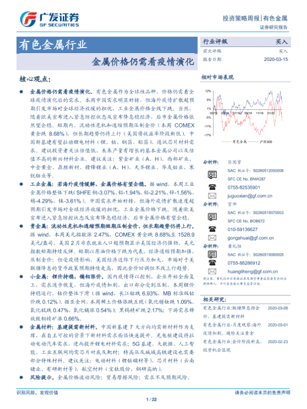 【广发证券】【20200315】20200315-广发证券-有色金属行业投资策略周报:金属价格仍需看疫情演化-22页