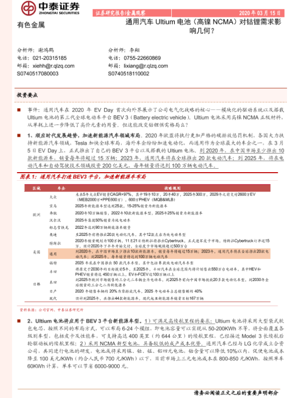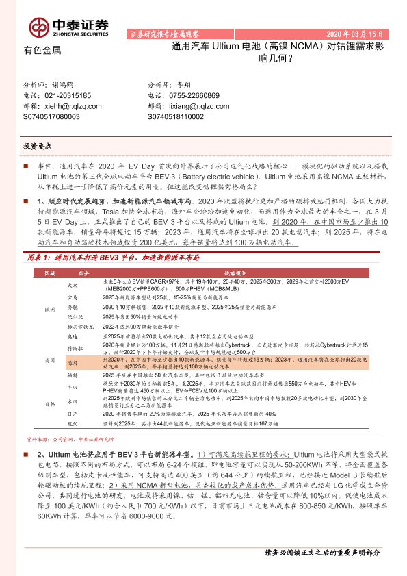 【中泰证券】【20200315】有色金属:通用汽车Ultium电池(高镍NCMA)对钴锂需求影响几何?-5页