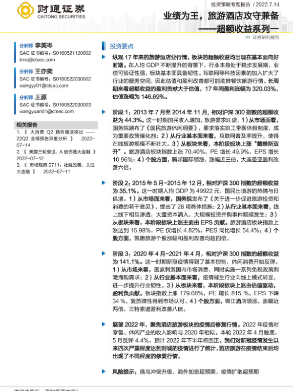 【财通证券】【20220714】超额收益系列一:业绩为王,旅游酒店攻守兼备-25页