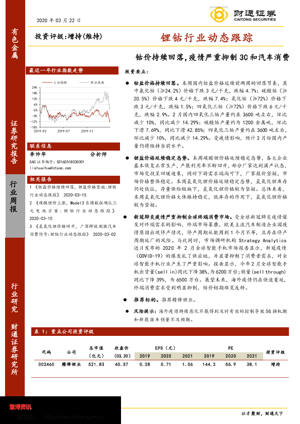 【财通证券】【20200322】锂钴行业动态跟踪:钴价持续回落,疫情严重抑制3C和汽车消费-6页