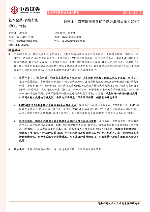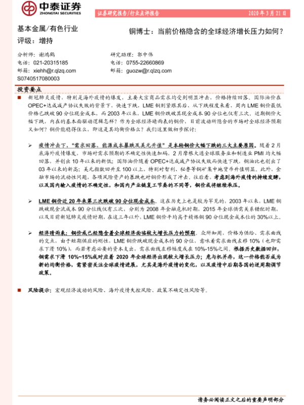 【中泰证券】【20200321】基本金属有色行业:铜博士:当前价格隐含的全球经济增长压力如何?-9页