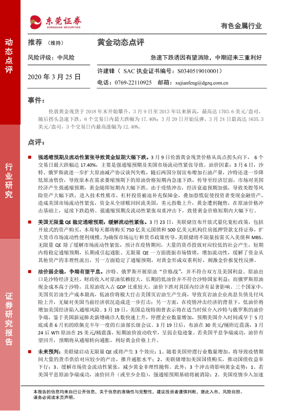 【东莞证券】【20200325】有色金属行业:黄金动态点评:急速下跌诱因有望消除,中期迎来三重利好-3页