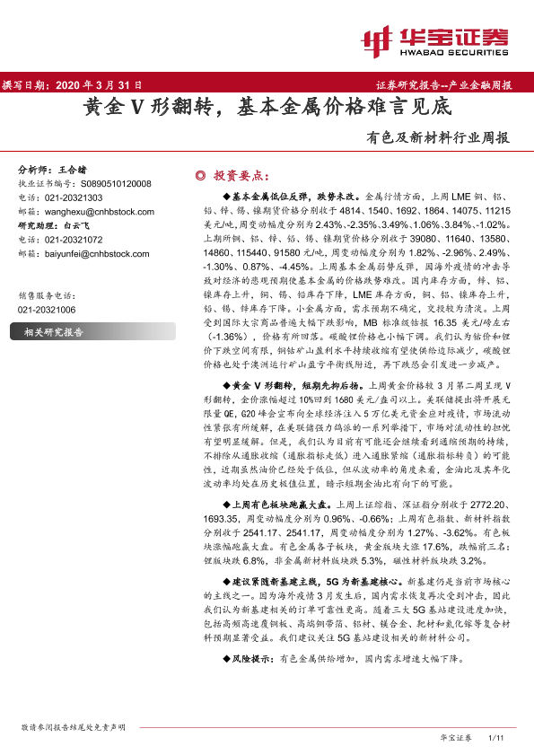 【华宝证券】【20200331】20200331-华宝证券-有色及新材料行业周报:黄金V形翻转,基本金属价格难言见底-11页