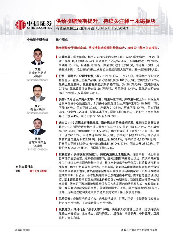 【中信证券】【20200403】20200403-中信证券-有色金属稀土行业半月谈(3月下):供给收缩预期提升,持续关注稀土永磁板块-32页