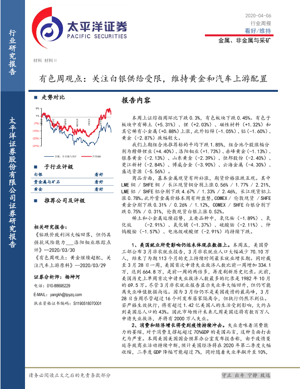 【太平洋证券】【20200406】有色周观点:关注白银供给受限,维持黄金和汽车上游配置-4页