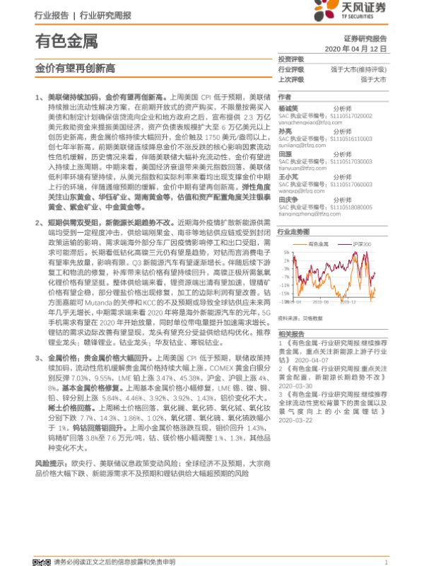 【天风证券】【20200412】20200412-天风证券-有色金属行业研究周报:金价有望再创新高-13页
