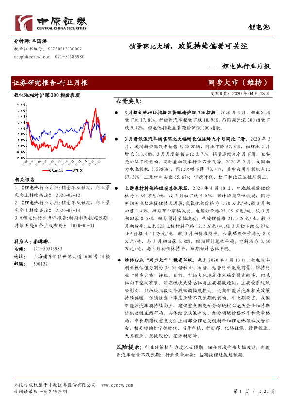 【中原证券】【20200413】锂电池行业月报:销量环比大增,政策持续偏暖可关注-22页