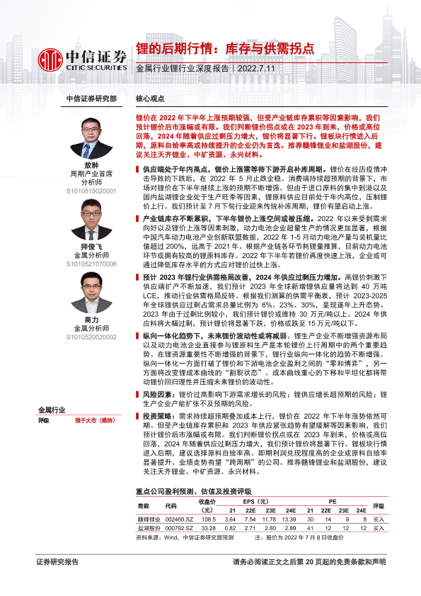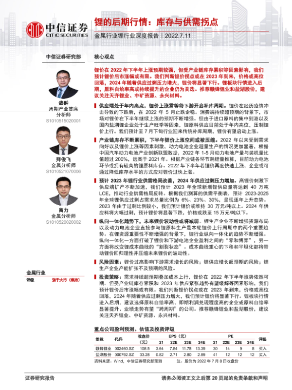 【中信证券】【20220711】金属行业锂行业深度报告:锂的后期行情,库存与供需拐点-25页