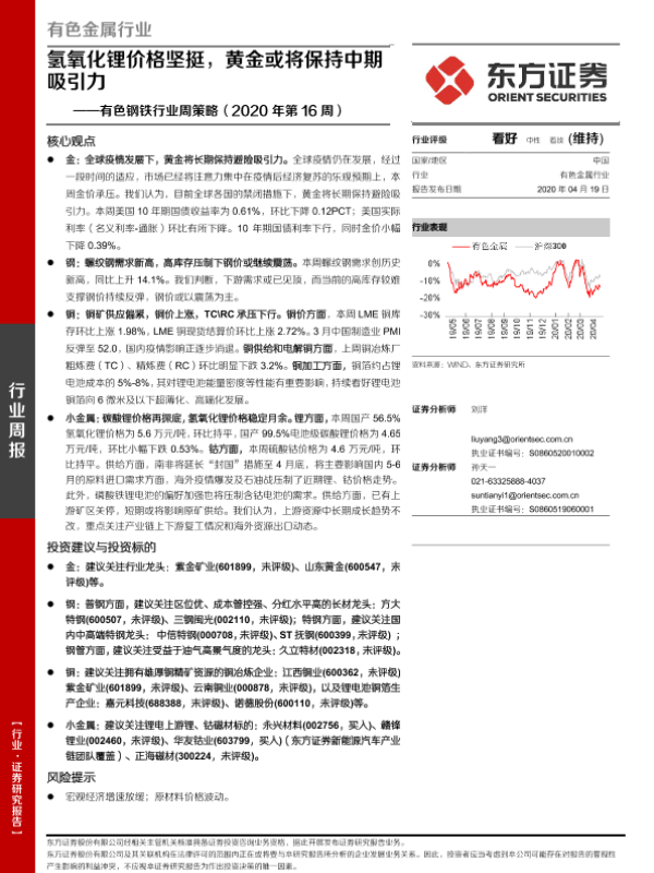 【东方证券】【20200419】有色钢铁行业周策略(2020年第16周):氢氧化锂价格坚挺,黄金或将保持中期吸引力-27页