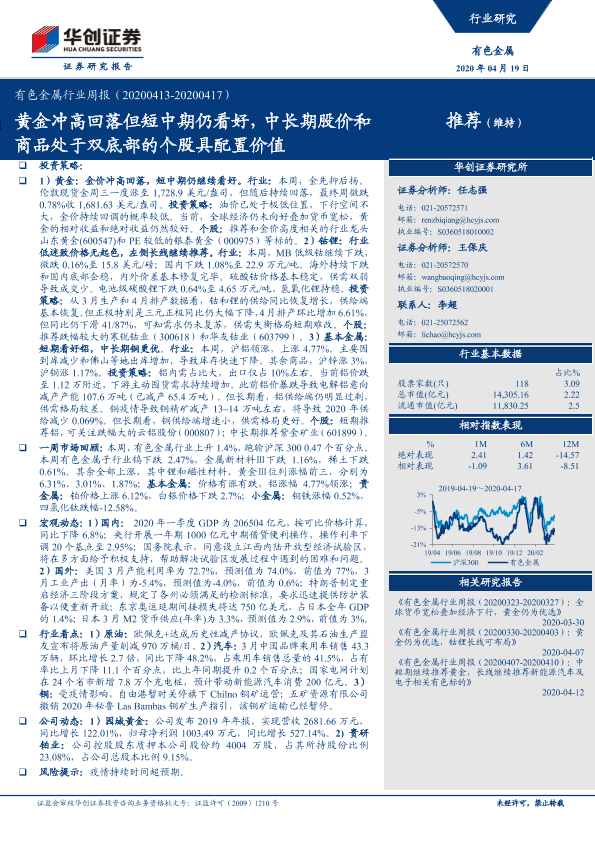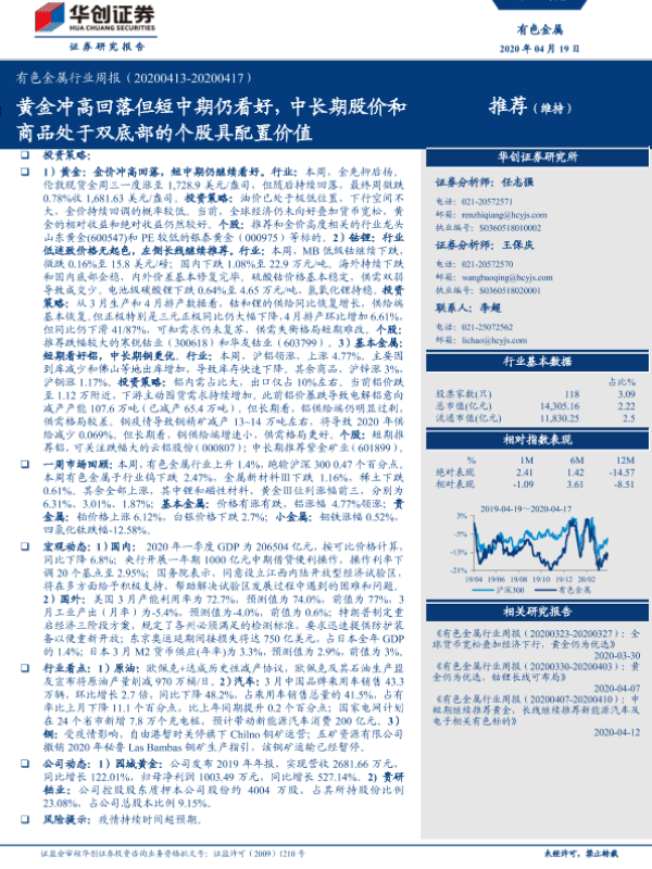【华创证券】【20200419】20200419-华创证券-有色金属行业周报:黄金冲高回落但短中期仍看好,中长期股价和商品处于双底部的个股具配置价值-17页