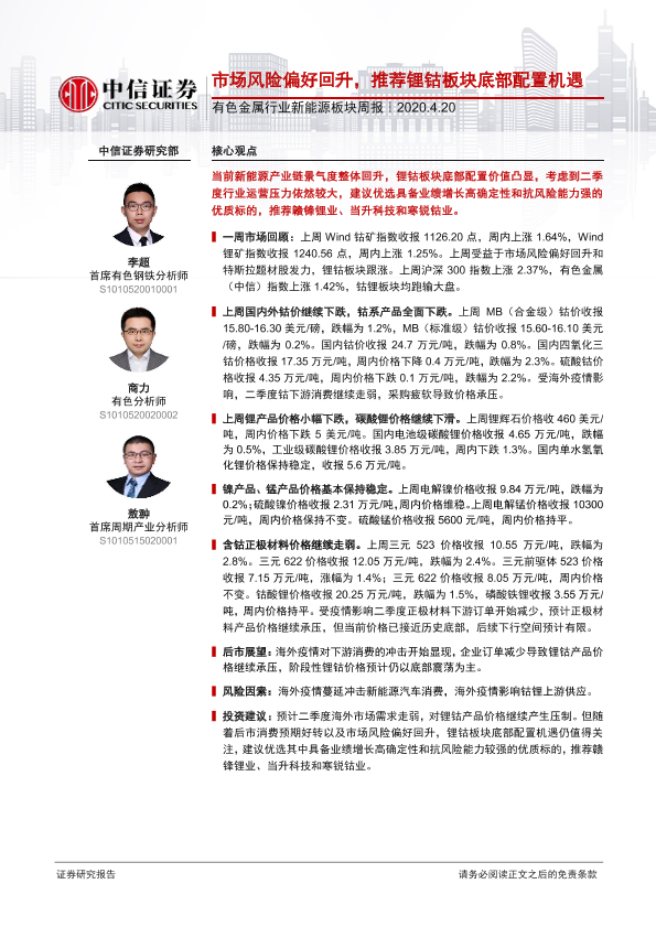【中信证券】【20200420】20200420-中信证券-有色金属行业新能源板块周报:市场风险偏好回升,推荐锂钴板块底部配置机遇-15页