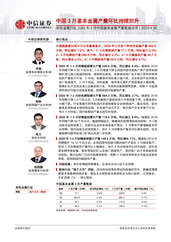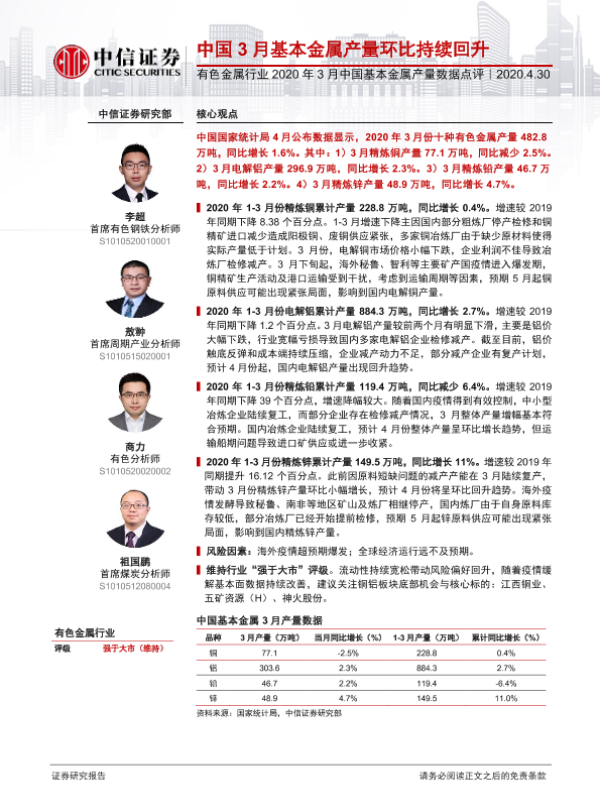 【中信证券】【20200430】2020年3月中国基本金属产量数据点评:中国3月基本金属产量环比持续回升-6页