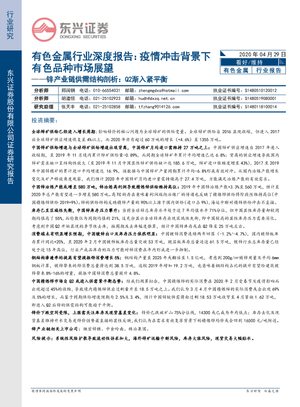 【东兴证券】【20200429】疫情冲击背景下有色品种巿场展望——锌产业链供需结构剖析:Q2渐入紧平衡-21页