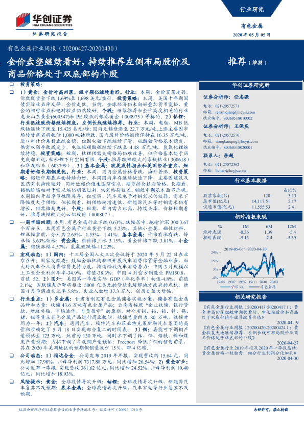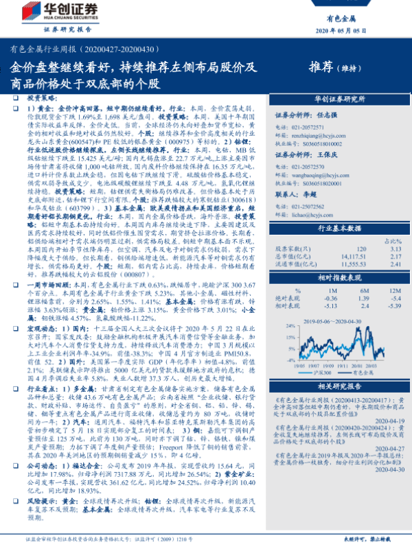【华创证券】【20200505】20200505-华创证券-有色金属行业周报:金价盘整继续看好,持续推荐左侧布局股价及商品价格处于双底部的个股-21页